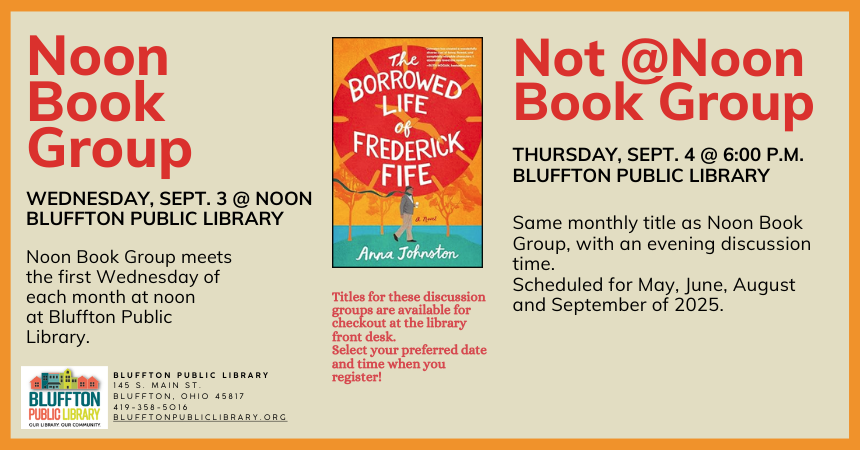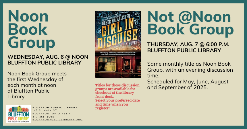 Noon Book Group (R) meets Wed., Aug. 6. The group will discuss Girl in Disguise by Greer Macallister. The book that will be discussed on Sep. 3 is The Borrowed Life of Frederick Fife by Anna Johnston. Stop by the library front desk to register and pick up the book, and to receive email updates!