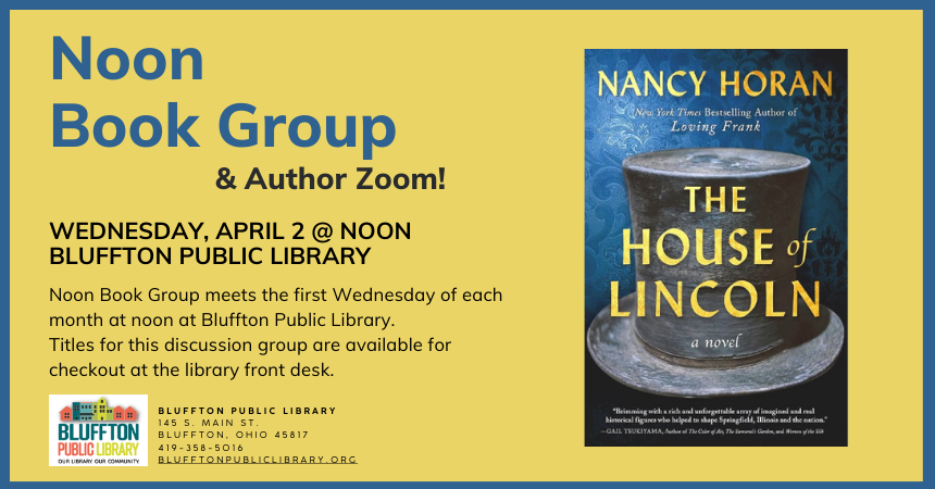 On Wed., Apr. 2 at 12:00 p.m., the Noon Book Group will discuss The House of Lincoln with author Nancy Horan via Zoom.