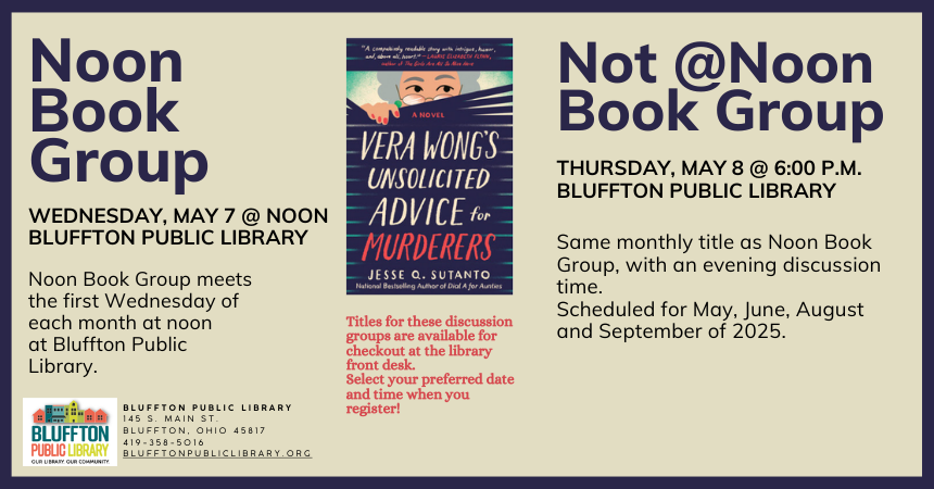 Noon Book Group (R) meets Wed., June 4. The group will discuss Tom Lake by Ann Patchett. The book that will be discussed July 3 is The Rosie Project by Graeme Simsion. Stop by the library front desk to register and pick up the book, and to receive email updates!