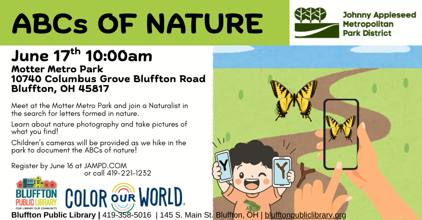 “ABCs of Nature” Walk at Motter Metro Park with Johnny Appleseed Metro Park District (R) will be held on Tue., June 17 at 10:00 a.m. Meet at the Motter Metro Park and join a Naturalist in the search for letters formed in nature. Learn about nature photography and take pictures of what you find! Children’s cameras will be provided as we hike in the park to document the ABCs of nature! Register by June 16 at JAMPD.COM or call 419-221-1232.