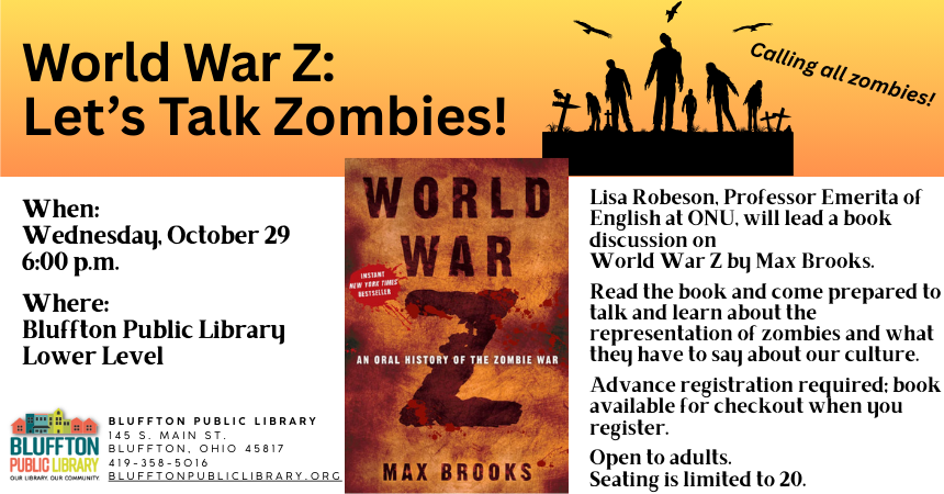 LET’S TALK ZOMBIES! (R) Lisa Robeson, Professor Emerita of English at ONU, will be leading a book discussion on World War Z by Max Brooks on Wed., Oct. 29 at 6:00 p.m. in the lower level of the library. Come prepared to discuss the book and learn about zombies in literature.