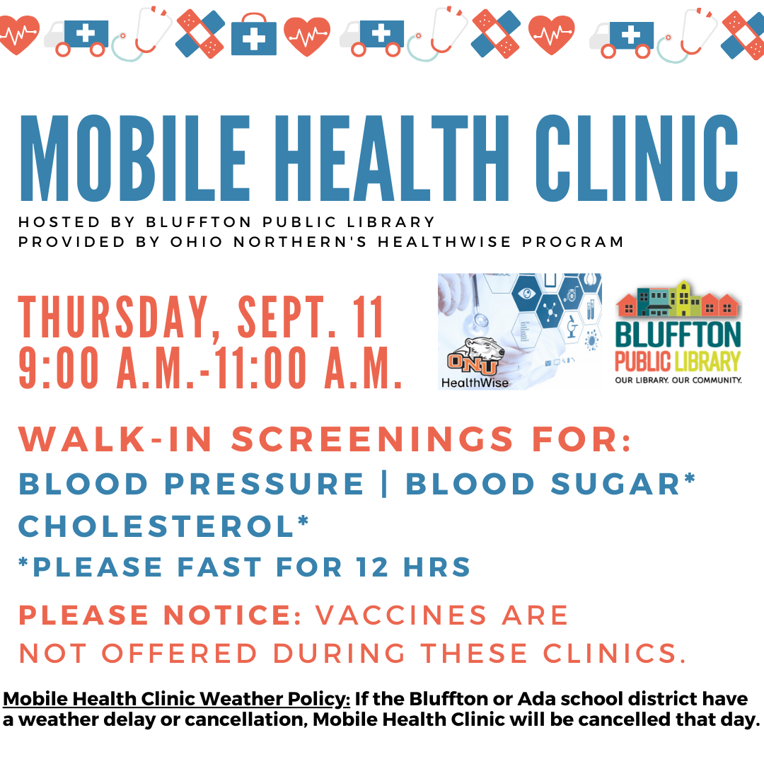 *Note: Mobile Health Clinic Weather Policy: If the Bluffton or Ada school district have a weather delay or cancellation, Mobile Health Clinic will be cancelled that day.