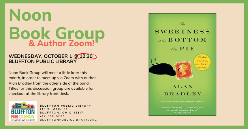 Noon Book Group (R) meets Wed., Oct. 1 at a slightly later time at 12:30 p.m. and the group will discuss The Sweetness at the Bottom of the Pie by Alan Bradley, and the author will be joining the group via Zoom. Stop by the library front desk to register and pick up the book, and to receive email updates!
