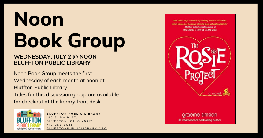 Noon Book Group (R) meets Wed., July 2. The group will discuss The Rosie Project by Graeme Simsion The book that will be discussed August 6 is Girl in Disguise by Greer Macallister.