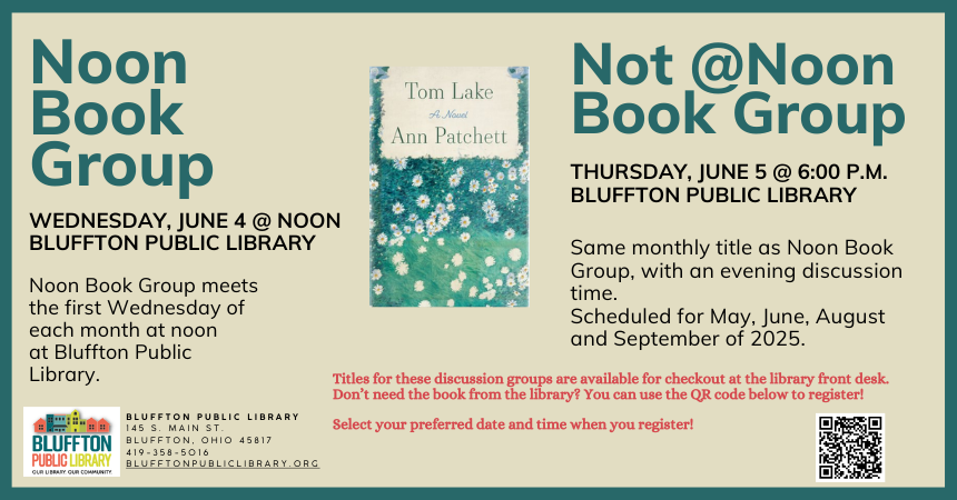 Noon Book Group (R) meets Wed., June 4. The group will discuss Tom Lake by Ann Patchett. The book that will be discussed July 3 is The Rosie Project by Graeme Simsion. Stop by the library front desk to register and pick up the book, and to receive email updates!