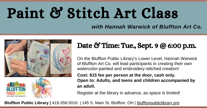 On the Bluffton Public Library’s Lower Level, Hannah Warwick of Bluffton Art Co. will lead participants in creating their own watercolor-painted and embroidery-stitched creation!