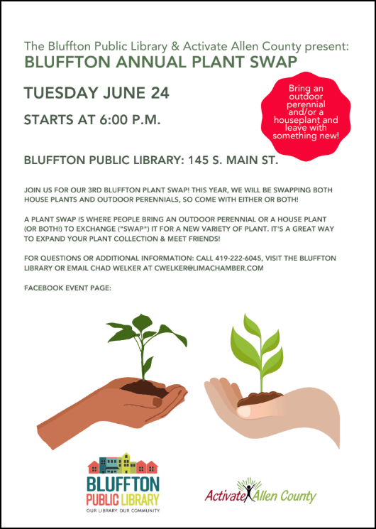 Plant Swap with Activate Allen County: Join us for our 3rd Bluffton Plant Swap! on Tue., June 24 at 6:00 p.m. This year, we will be swapping both house plants and outdoor perennials, so come with either or both. A plant swap is where people bring an outdoor perennial plant (in good condition) or a house plant (or both) to exchange (“swap”) it for a new variety of plant. It’s a great way to expand your plant collection & meet friends! Numbers will be assigned as participants arrive & everyone can go home with a new plant for their collection.