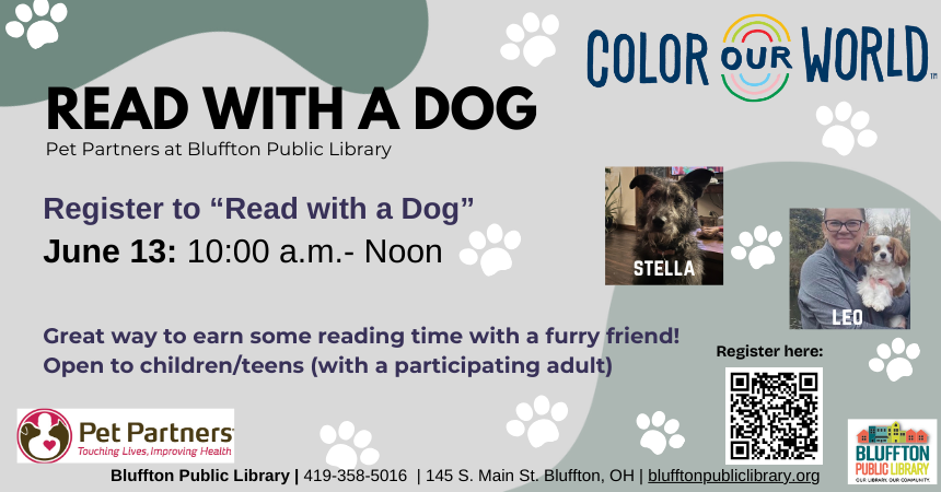 Read with a Dog (Pet Partners) (R): Our furry friends are back! This is a great way to earn some reading time with a furry canine friend on Fri., June 13 at 10:00 a.m.-12:00 p.m.