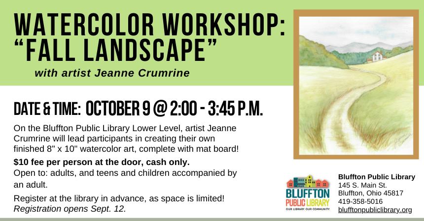 Watercolor Workshop: Fall Landscape (R)($) will be held Thu., Oct. 9 from 2:00 p.m. - 3:45 p.m.