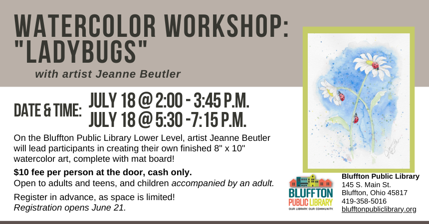 Watercolor Workshop: Two sessions of Ladybugs (R)($) will be held on Thu., July 18. The first runs from 2:00 - 3:45, and then the second is at 5:30 p.m. to 7:15 p.m. Local artist Jeanne Beutler will teach on the lower level of the library. Walk away with your own watercolor piece of art, complete with mat! There is a $10 supply fee at the door (cash only please), and advance registration is required as space is limited.