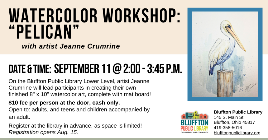 Watercolor Workshop: Pelican (R)($) will be held Thu., September 11 from 2:00 p.m. - 3:45 p.m. Local artist Jeanne Crumrine will teach on the lower level of the library. Walk away with your own watercolor piece of art, complete with mat!