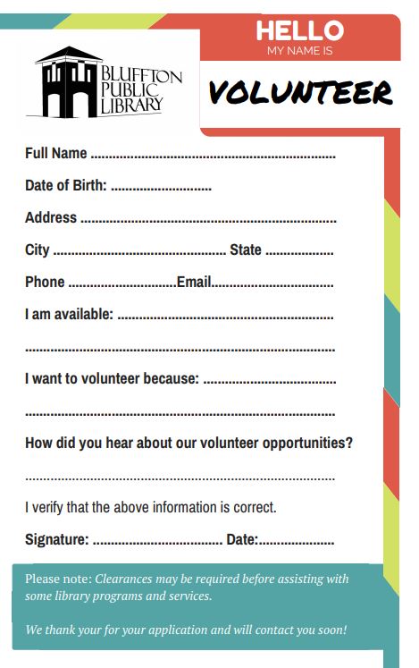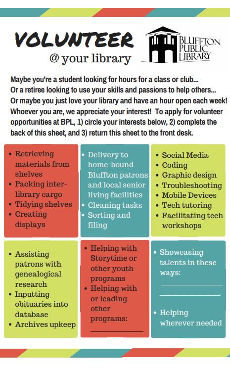 Applications are available at the library circulation desk or you can download the brochure/form directly to your computer by clicking here. Please note: Clearances may be required before assisting with some library programs and services. To receive more information, please contact us at 419-358-5016 or psc@blufftonpubliclibrary.org.